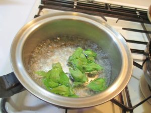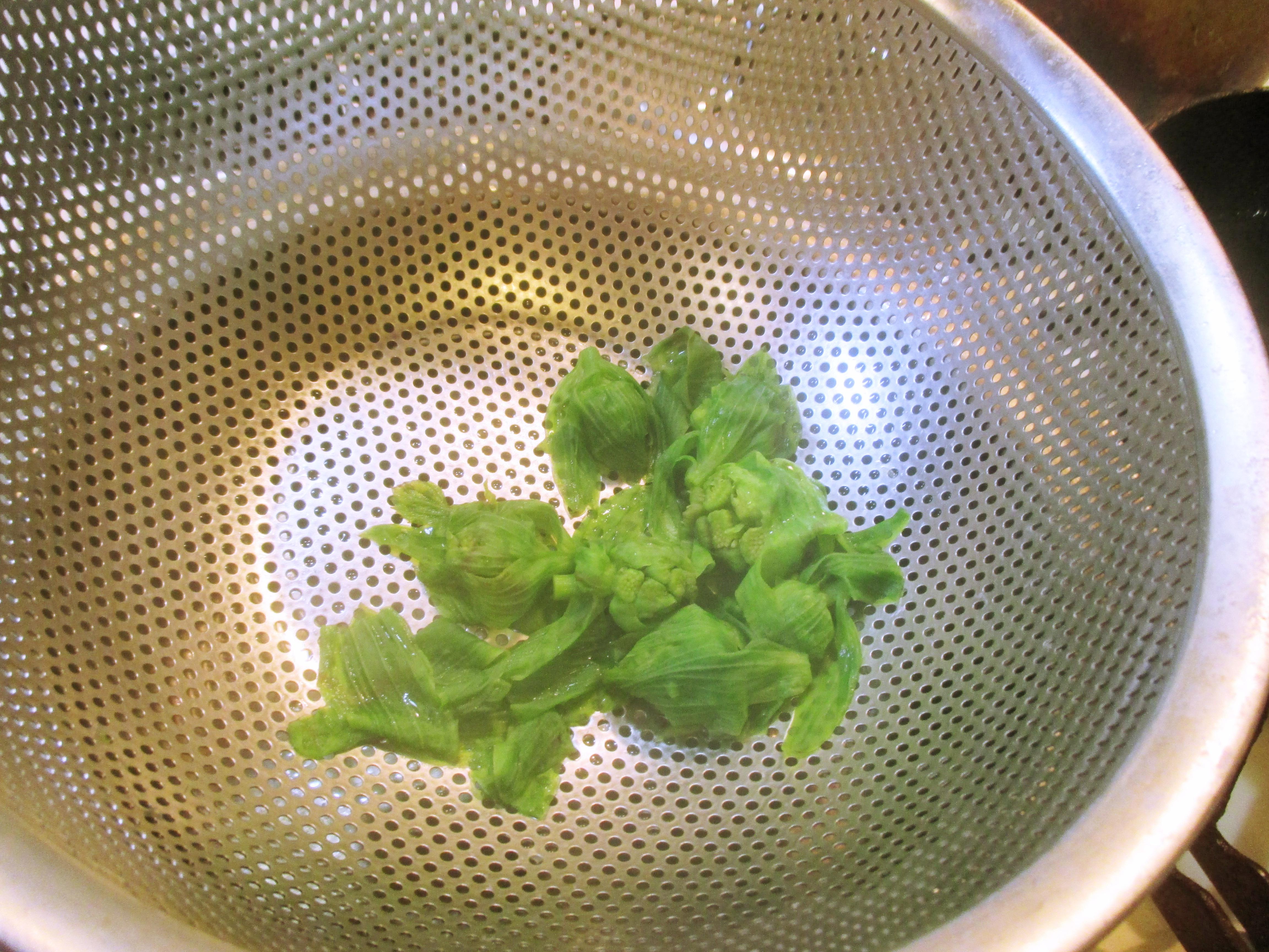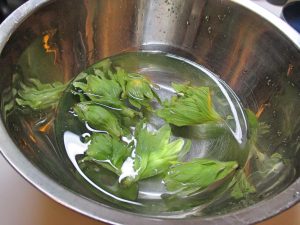 2、沸騰したお湯に塩ひとつまみを入れ、フキノトウをさっとゆでる