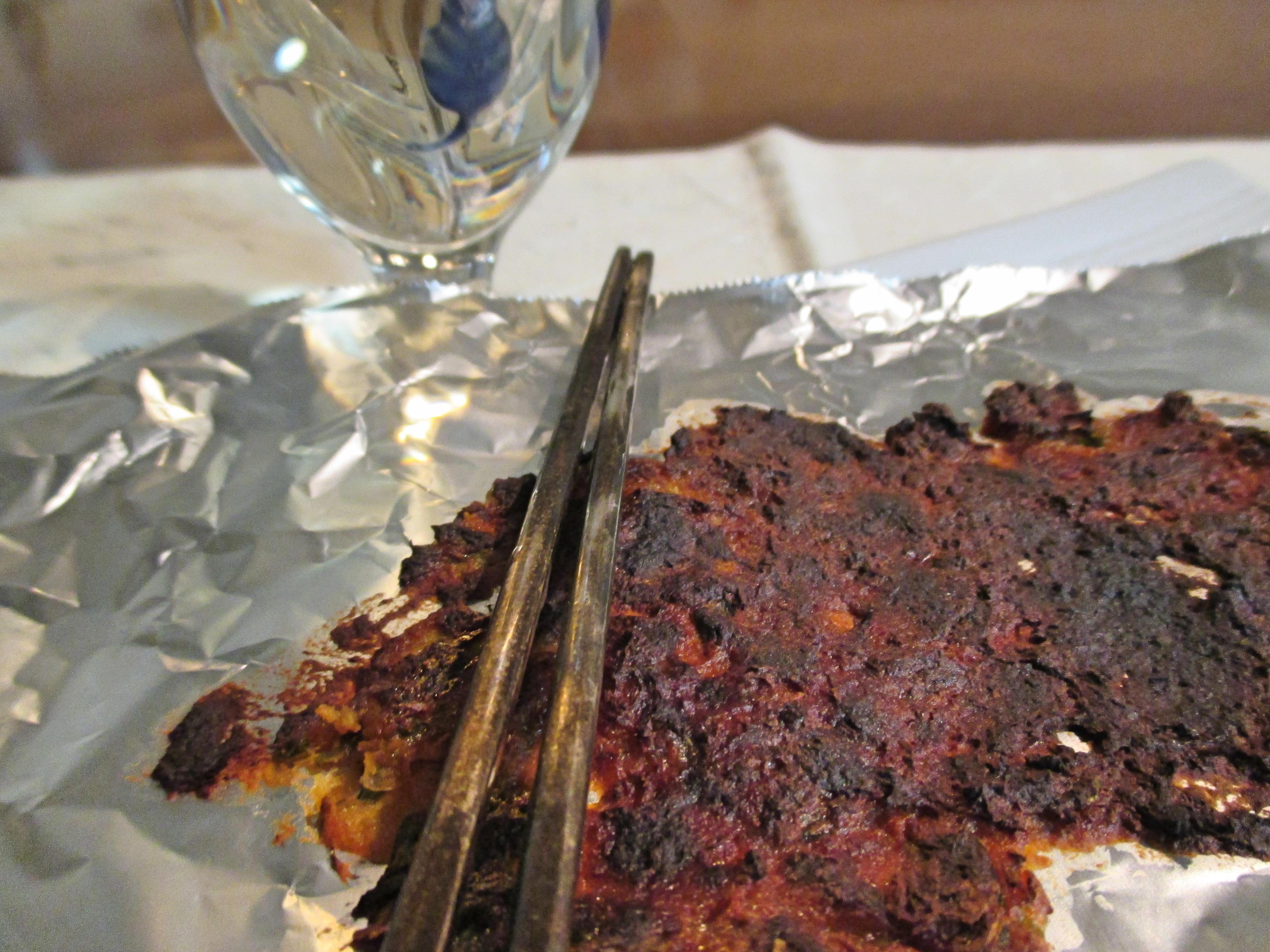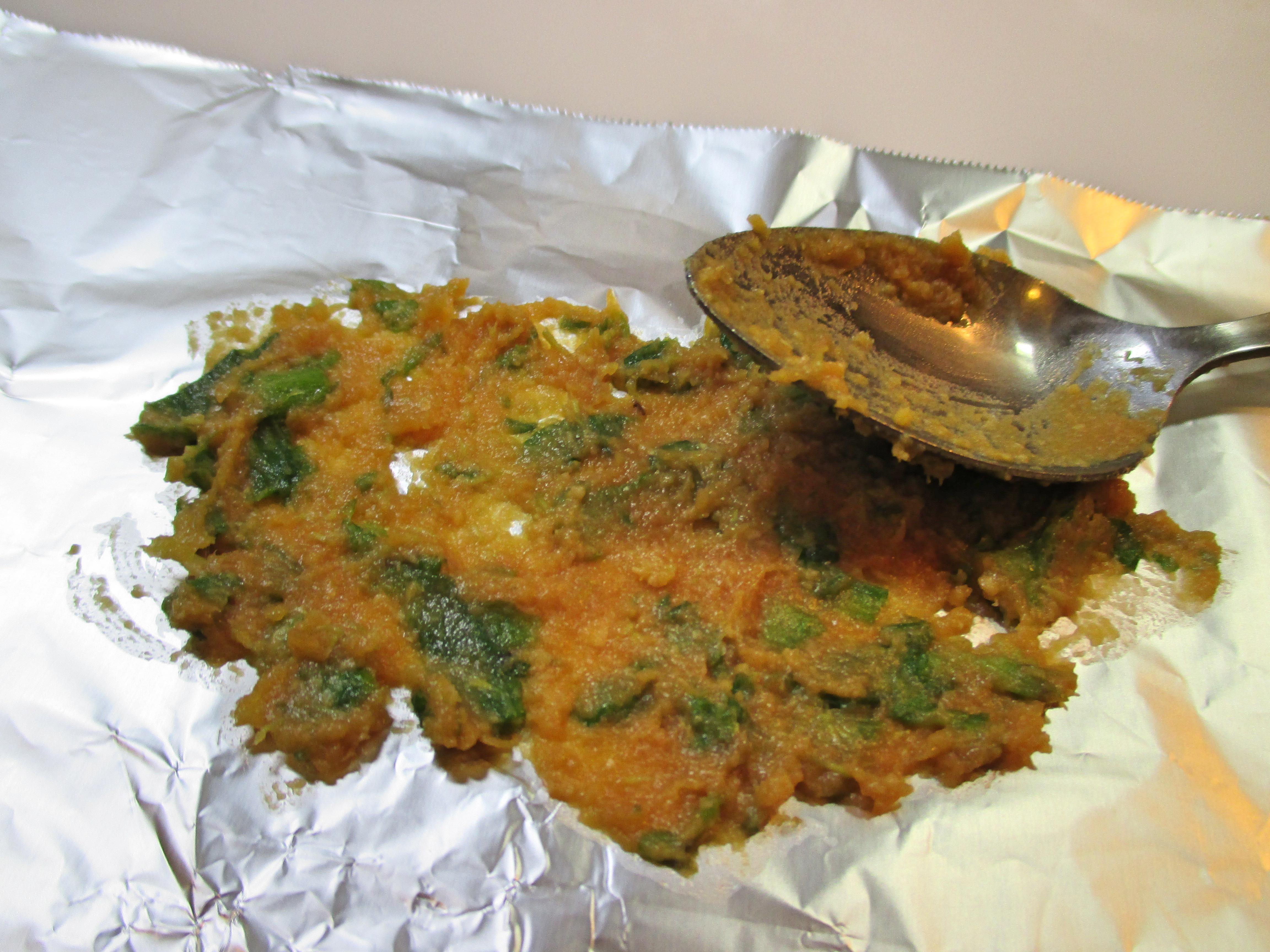 スプーンの背を使って、広げたアルミホイルに薄くフキノトウ味噌を延ばし、魚焼きグリルに入れて焼いてみました。