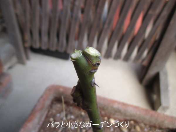 手前の枝は、ちょうど良い高さに外芽がありますが、黒く潰れたようになっています。でも、よーくよーく見ると0.5mmくらいの小さな赤い点があるので、これに期待することにします。