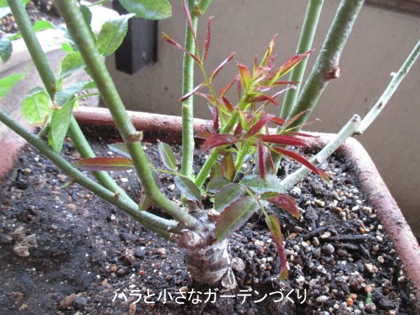我が家のバラでは、「レディエマハミルトン」「マザーズディ」、つるバラの「紅玉」がシュート更新の激しいタイプです。ミニバラにもいくつかあります。