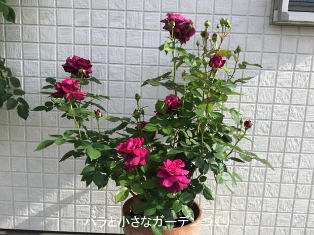 を観賞する高さからいえば、地植えなら1m以下、鉢植えなら70cm以下でいいのですが、鉢植えバラの場合はよりコンパクトにするよう心がけたいもの。