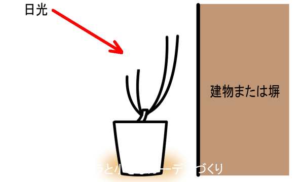 こういう場所では日光は前面からしか差さず、壁側は極端に暗くなるので、日光が当たる方を短く、壁側を高くしているのです。こうすることで、壁側の枝にもしっかり日光が届きます。