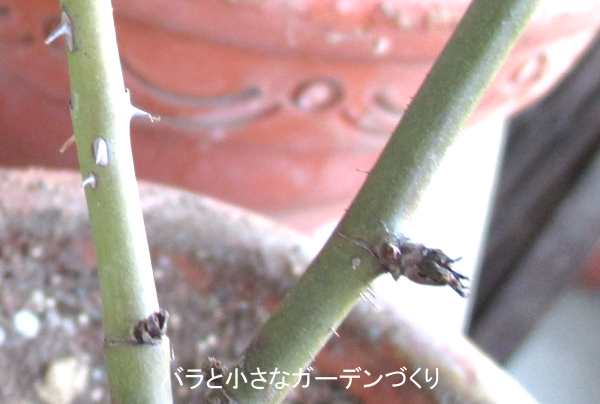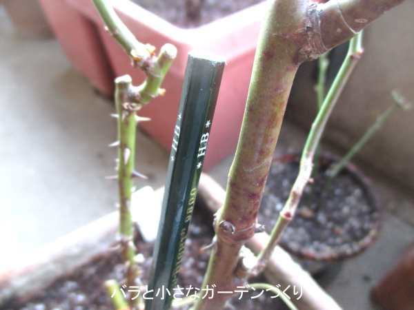 上の写真に写っている3本の枝のうち、鉛筆の太さより太い中央の枝だけが大輪花を咲かせられる枝です。左右の枝を残しても、花を咲かせることができないので、鉛筆の太さのあるところまで切り戻すか、つけ根から切り取ります。
