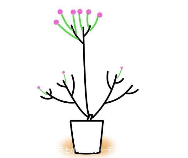 株のエネルギーは「飛び出し枝」ばかりに注がれます。「飛び出し枝」は旺盛に生長し、花もたくさん咲かせます。一方、それ以外の枝は生長を止めてしまいます。なんとか蕾を上げても、貧弱な花しか咲かせることができません。