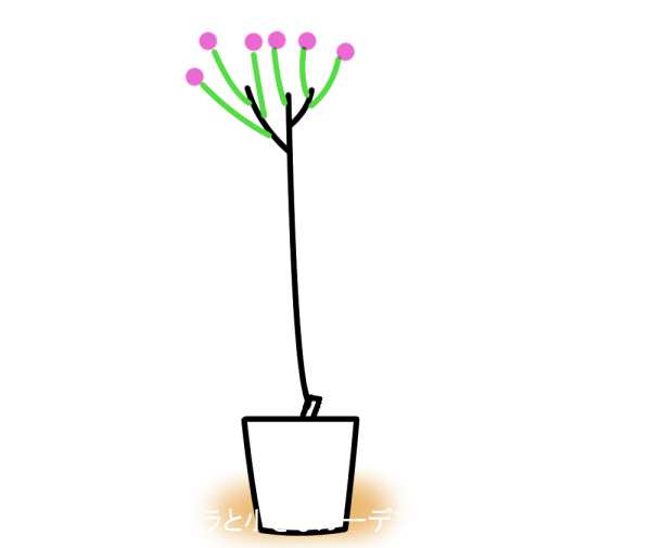 「飛び出し枝」のある株は、いずれ生長できなかった周りの枝が枯れ、「飛び出し枝」だけが残ってしまいます。こうして意図せずに、スタンダード仕立てのようになってしまいがちです。