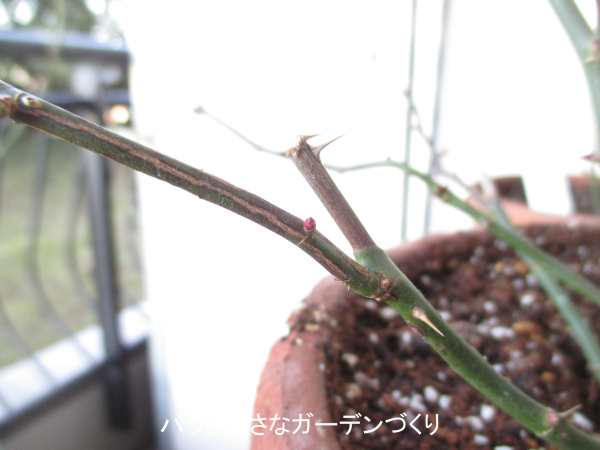 おそらく、剪定後に新芽がうまく生育できなかった枝だろうと思います。一応、頂芽が伸びようとしていますが、よく見ると枝の付け根に赤い芽があります。株自身がこの枝を諦め、枝の更新をしようとしているようです。
