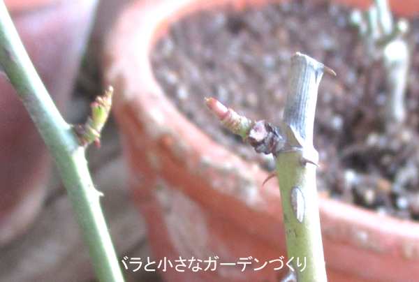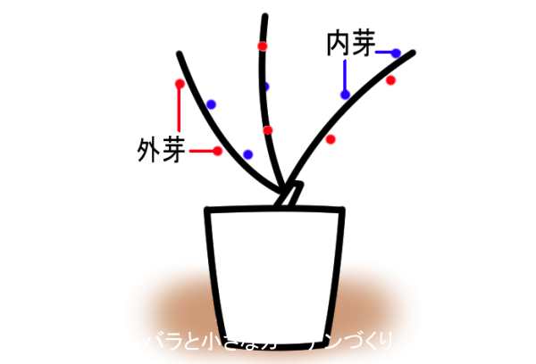 ラの枝の、株の外側についているのが外芽、内側についているのが内芽です。上の図でいえば、赤い芽が外芽で、青い芽が内芽です。