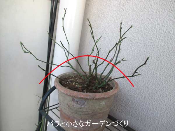 根の大きさと地上部分の大きさは比例しています。鉢植えバラは根が小さい分だけ地上部分が大きくなりすぎないよう、コンパクトに仕立てた方が良い結果につながります。しっかり深いめに冬剪定しましょう。