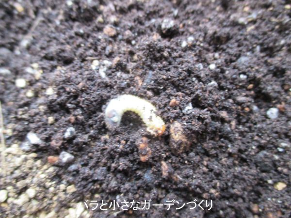 の中から長さ2cmほどの、上の写真のようなクリーム色の幼虫が出てきたら! これはコガネムシの幼虫です。コガネムシの幼虫はバラの根を食べる、バラにとっては怖い害虫です。鉢にこの虫がいたのなら、そのバラは根を食べられ、かなり弱っているはずです。
