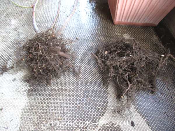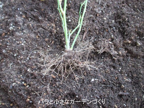ただし、イングリッシュローズなどの輸入苗には「ロサ・ラクサ」の台木が使われていることがあります。「ロサ・ラクサ」は見事なごぼう根ですが、これは問題ありません。正常な状態です。