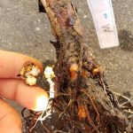 がん腫は根の途中にもでき、ポロリと指で簡単に取れます。がん腫はゆでた大豆のようにクリーム色で、ぐじゅぐじゅと湿った感触です。