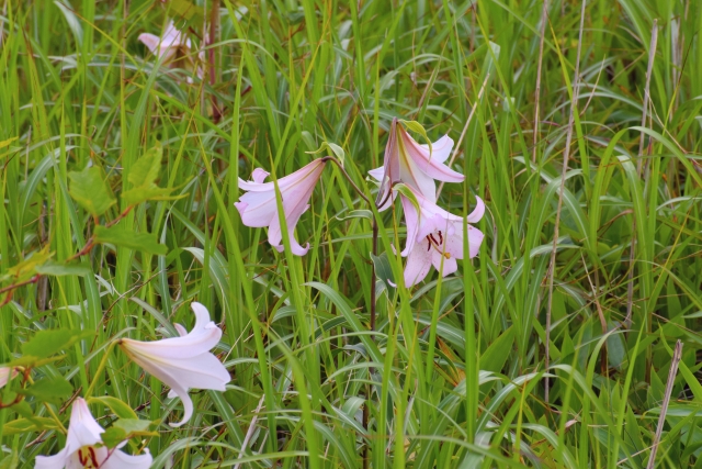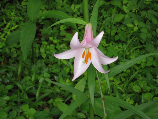 ササユリも日本固有の原種ユリです。透明感のあるピンク色の花(花径10~15cmほど)を咲かせるササユリは、ヤマユリよりも小型で草丈1mほど。笹の葉のような葉をしているので「笹百合」の名があります。ヤマユリほど強烈ではありませんが、すがすがしい良い香りをもちます。連作を嫌い、栽培するのは難しいです。花期は6月~7月。半日陰を好みます。
