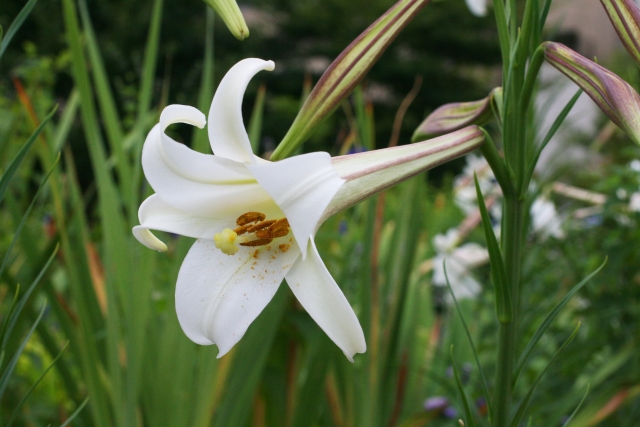 ちなみに、これがラッパ銃。英語では blunderbuss といいます。確かにテッポウユリにそっくりな形の銃ですね。テッポウユリは学名で Lilium longiflorum(リリウム・ロンギフローラム)といいます。「longiflorum」は「長い花」という意味です。
