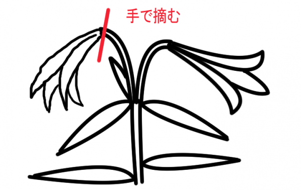 花がしおれたら、かならず手で花がらを摘み取ります。そのままにしておくと灰色カビ病の原因になったり、種ができて球根に栄養が回らなくなったりします。ウイルス病がハサミを介してうつることがあるので、必ず手でもぎ取ります。