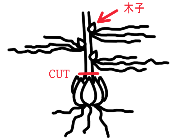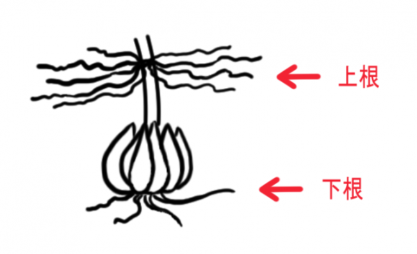 ず茎をもって球根を引き抜きます。上の図を参考に、茎を球根の上で切り取り上根を取り除きます。さらに枯れている下根も取り除き、枯れていない元気な下根は残します。球根が完全に分かれているものは、手で割って分球します。はっきり分かれていない球根は、そのまま植えます。