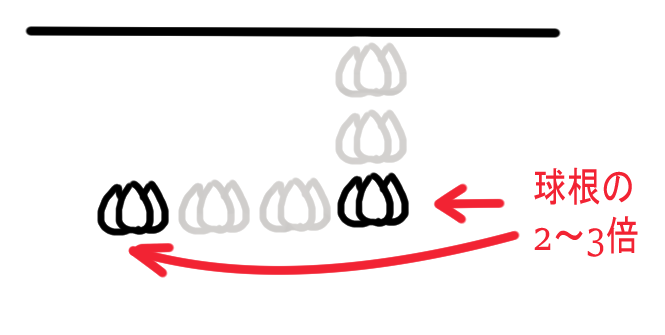 リは球根を支える下根と養分を吸収する上根があるので、上根が十分育てるように球根の大きさの2~3倍の深さに下根を広げて植えます球根と球根の間も、同じく球根の大きさの2~3倍の間隔をあけます