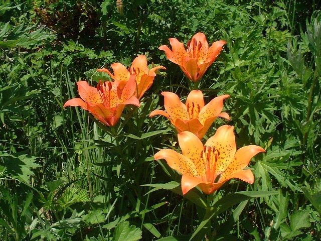 国や日本に自生しているカノコユリやオニユリは、花びらの先が強く反り返り、下向きに咲く原種ユリです。どちらも自生しているくらいなので日本の気候に合っていて丈夫で育てやすいユリです。かつてよく庭で栽培されていましたが、現在はあまり人気がありません。草丈はカノコユリで50cm~1.5m、オニユリで1~1.8m。花径10cmほど。花期はオニユリが6月~7月カノコユリが8月。オニユリは日向を好み、カノコユリは半日陰を好みます。