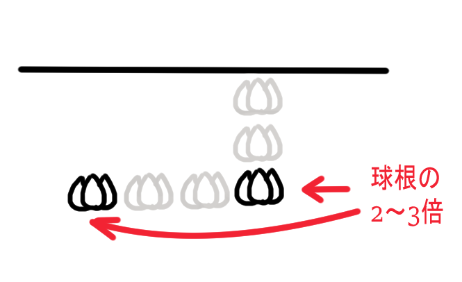 リは球根を支える下根と養分を吸収する上根があるので、上根が十分育てるように球根の大きさの2~3倍の深さに下根を広げて植えます球根と球根の間も、同じく球根の大きさの2~3倍の間隔をあけます