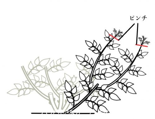 ベイサルシュートの先のつぼみも、同じように小さいうちにピンチします。上の図は大苗用のイラストですが、シュート処理のしかたは新苗でも同じです。