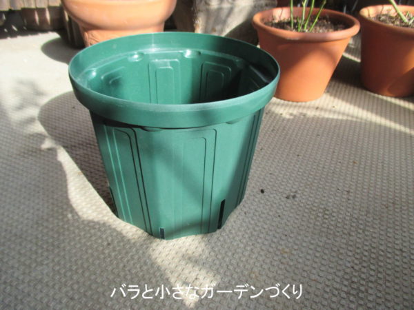 新苗は、どれも仮植えの状態で販売されています。売られていた鉢のまま育てることはできません。そのため、必ず育てるための鉢が必要です。口径と高さが同じくらいの上のような形の鉢がバラには適しています。