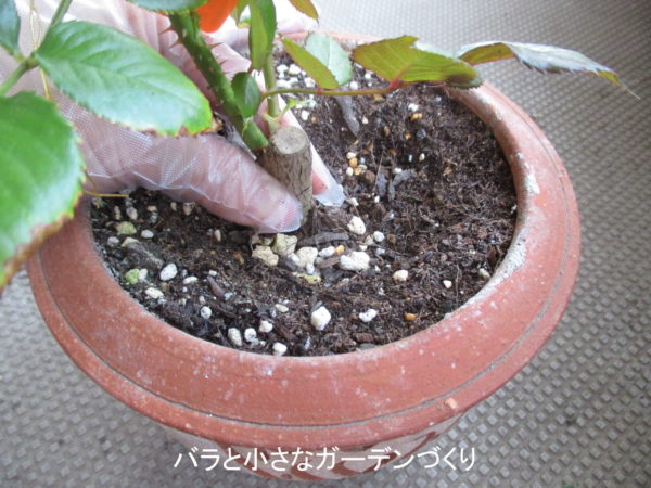 木立ちバラの植え替え方その6、バラの木の高さを調節しながら培養土を入れる