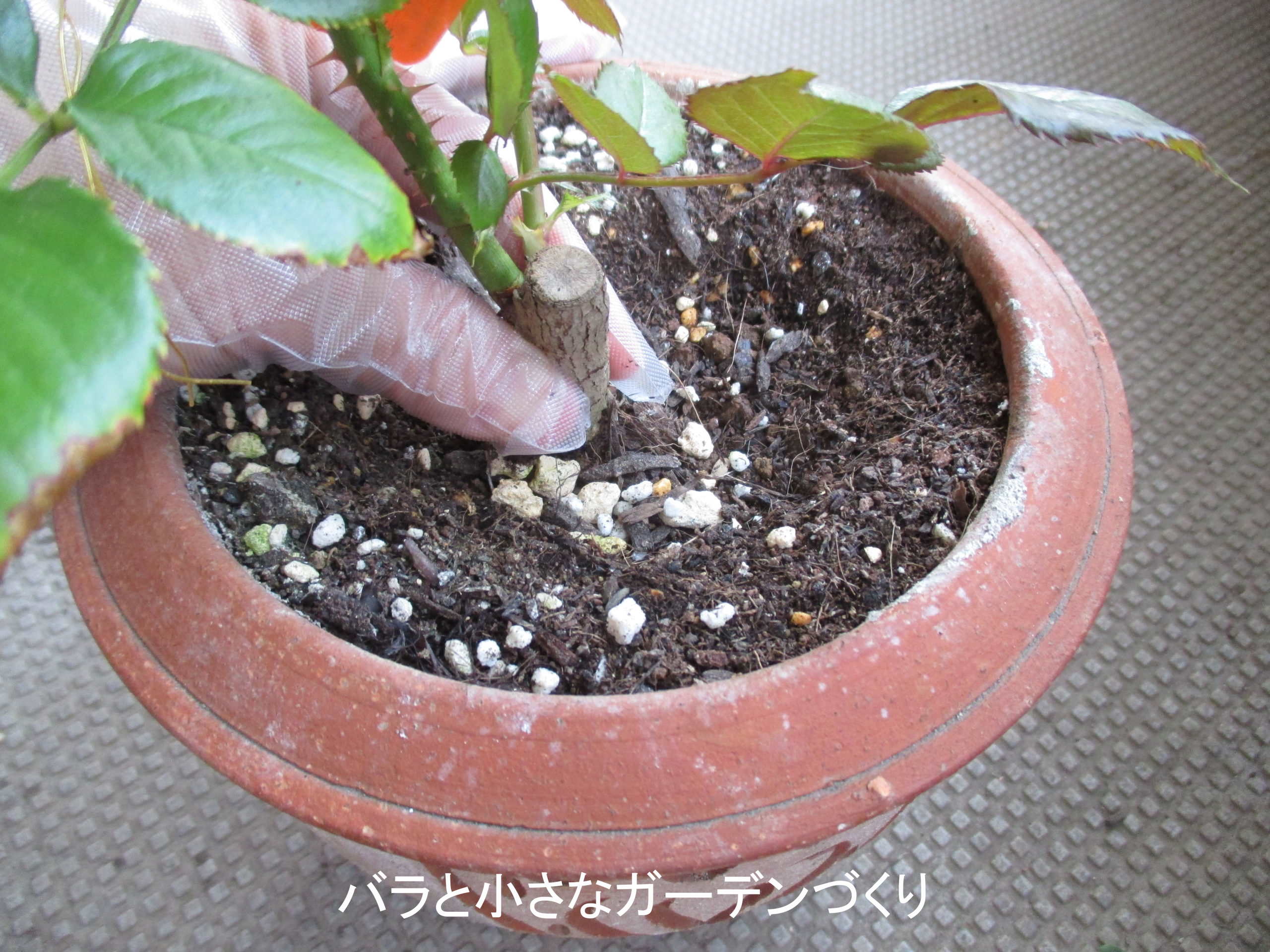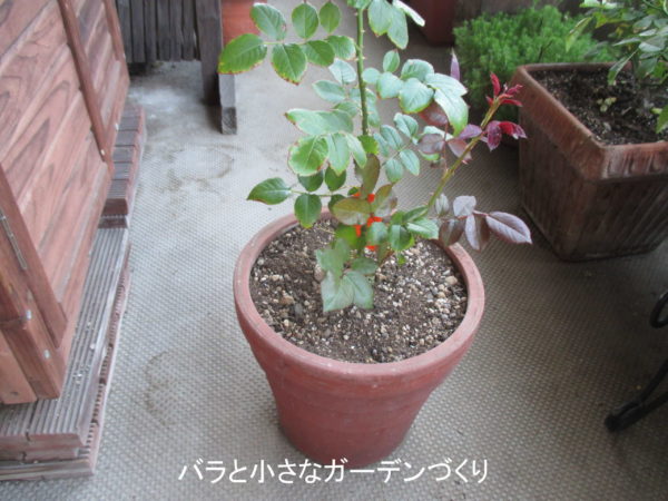 本来なら、初心者には晩秋~冬の間を中心に流通する大苗、または鉢苗から育てることをおすすめしますが、今回は春バラのシーズンに流通する新苗から育てる方法です。