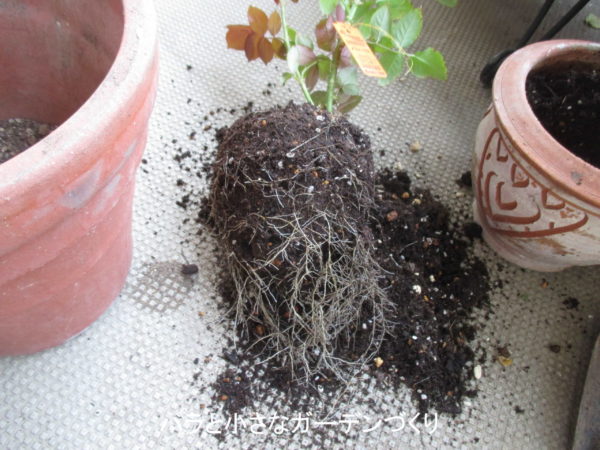 木立ちバラの植え替え方その2、鉢植えからバラを引き抜く
