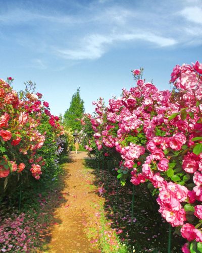 アンジェラはフェンスにアーチに、オベリスクにと、さまざまな場所に誘引できる、使いやすいバラです。