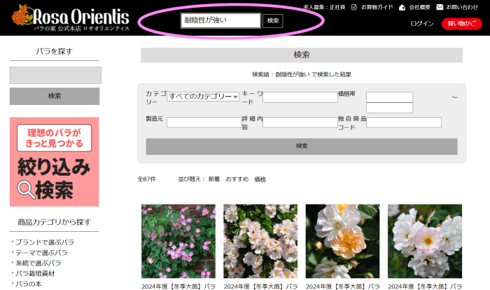 膨大なバラの品種を販売する「バラの家」のサイトでは、自社で取り扱うバラをさまざまな検索で抽出できるようになっています。