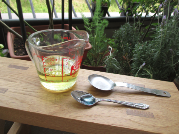 計量カップに植物性オイル100ccを入れ、そこに重曹大さじ1/2杯、食器用洗剤2~3滴を加えます。重曹が溶けるまでしっかり混ぜたら原液の完成です。