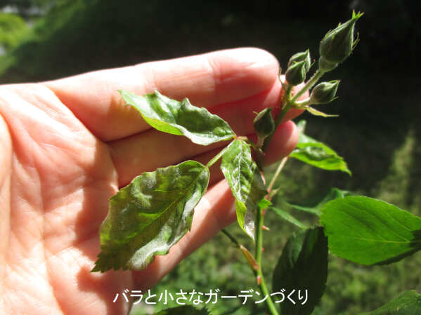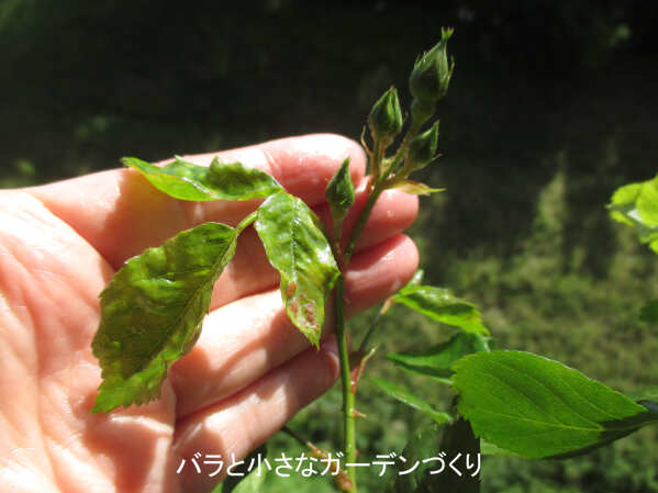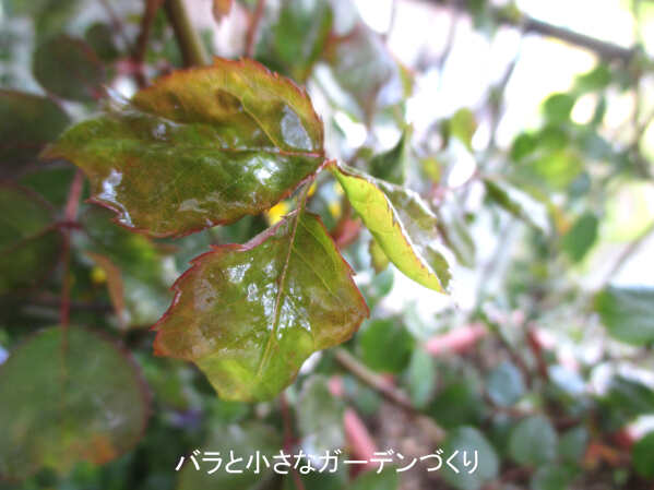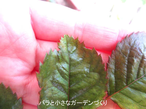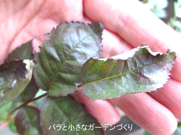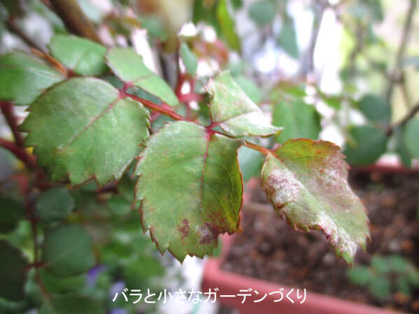 レディエマハミルトンの若葉についたウドンコ病。こちらは殺菌剤散布での治療痕が赤黒く残っています。