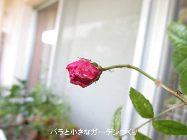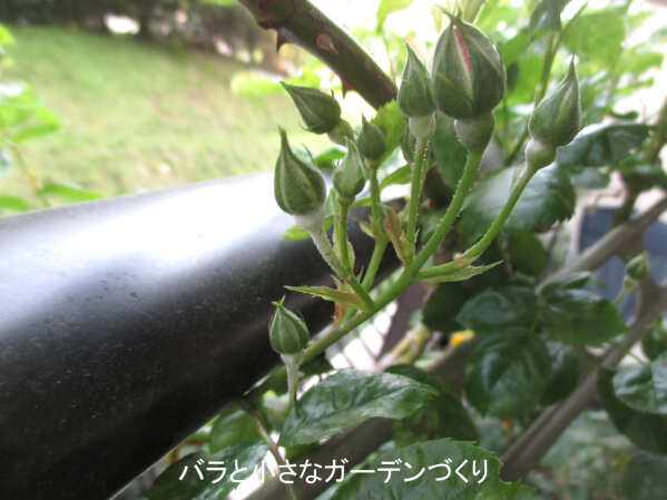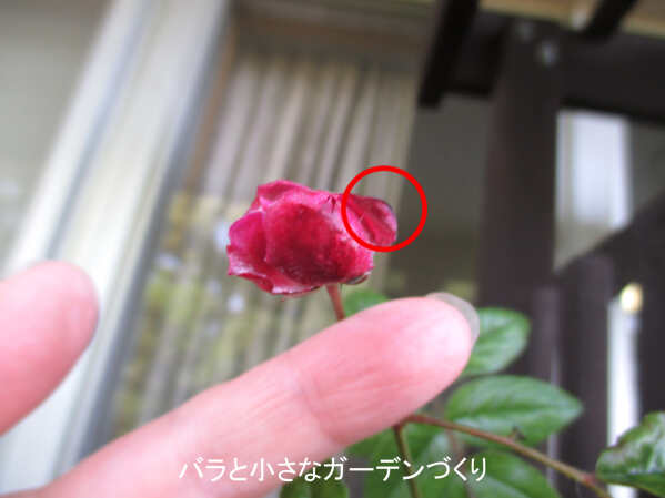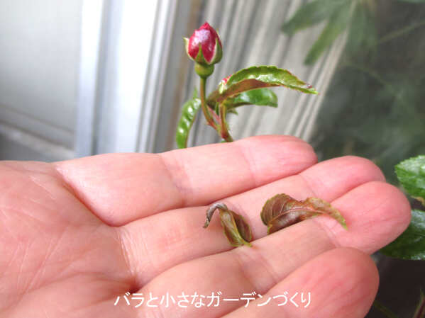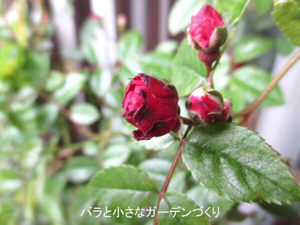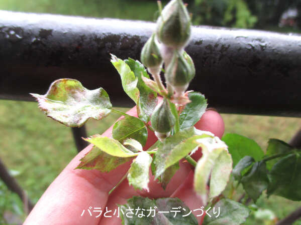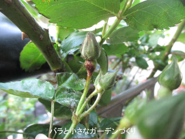 この蕾は株の手前にあり、近くにウドンコ病の若葉がたくさんあったので、とくに念入りに散布した場所です。黒くなってしまったのはこの1輪だけで、他の蕾は問題ありません。