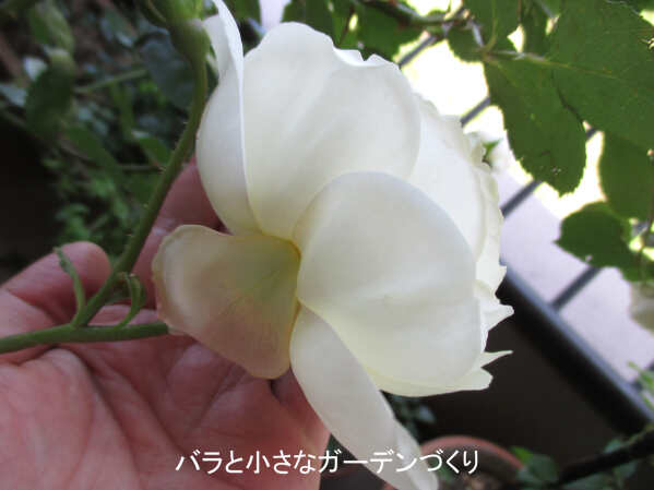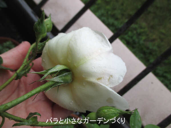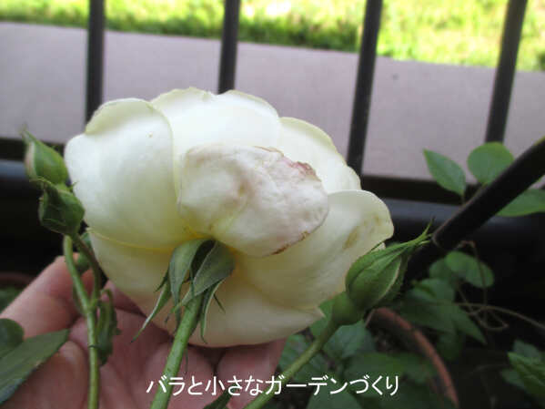 もはや我が家のベランダでウドンコ病のあるバラがほとんどなく、ようやくフェンスの裏側に隠れていたアンジェラの貴重なウドンコまみれの花房をみつけました。なかなか白いですね。