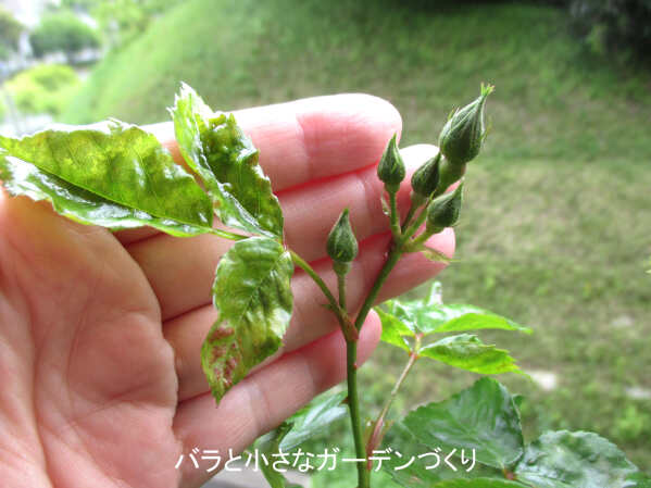 前回とは別のアンジェラの蕾に散布します。若葉と花柄の両方にウドンコ病があります。