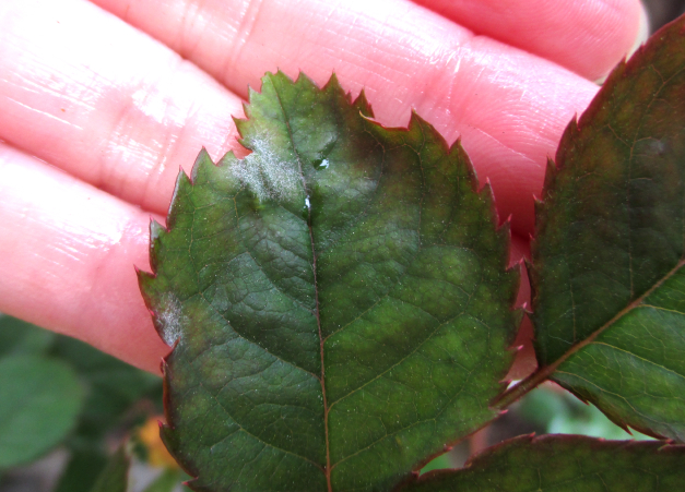 葉や花柄などの、スプレーがかかりきっていないところに、まだウドンコ病が残っているのが分かります。花柄は細かい産毛がついているので、スプレーがかかりにくいのかも知れません。