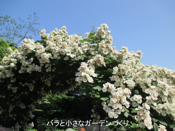 バラ園の入り口は、白いバラのアーチです。品種は「ペレニアルブラッシュ」。品種紹介のプレートには、花色は白~淡いピンクとあります。確かによく見ると、白だけでなく淡いピンクも混じっていますね。見るからにランブラー系つるバラですが、この容姿で夏にもよく返り咲くそうです。バラの家では「四季咲き」表示がされているほどです。いいですね^^