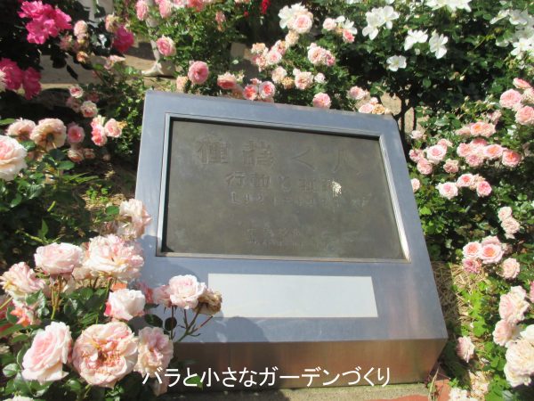 バラ園の傍らには「種撒く人」の記念碑があります。「種撒く人」は、小牧近江らにより大正10年に創刊された文学雑誌で、この雑誌には反戦平和をめざす詩や評論が掲載され、プロレタリア文学運動の先駆的な役割を果たしました。小牧近江は秋田県生まれですが、大正14年から亡くなる昭和54年まで鎌倉に住んだ文学者です。