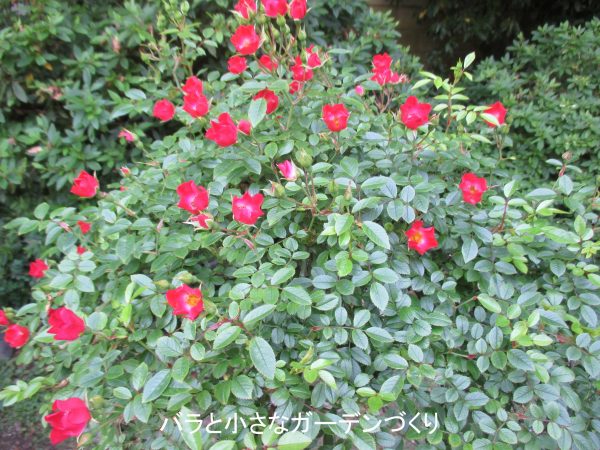 株いっぱいに咲く中心が白い一重の紅バラ「かまくら小町」は、「鎌倉」の作出者・大月啓仲さんの作。賑やかにお喋りしながら小町通りをそぞろ歩く女の子たちの雰囲気がありますね^^ 元気で若々しいイメージです。