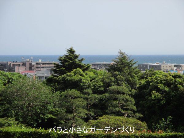 鎌倉文学館の内部は著作権保護の観点から撮影禁止のため、2階の端にある休憩室のベランダから外の眺めを撮影しました。由比ガ浜海岸の近くなので、意外と近くに海が見えます。森に囲まれ、海が望める、バラ園のある洋館──ぜいたくですねー! さすが加賀100万石の前田家だとため息が出ます!