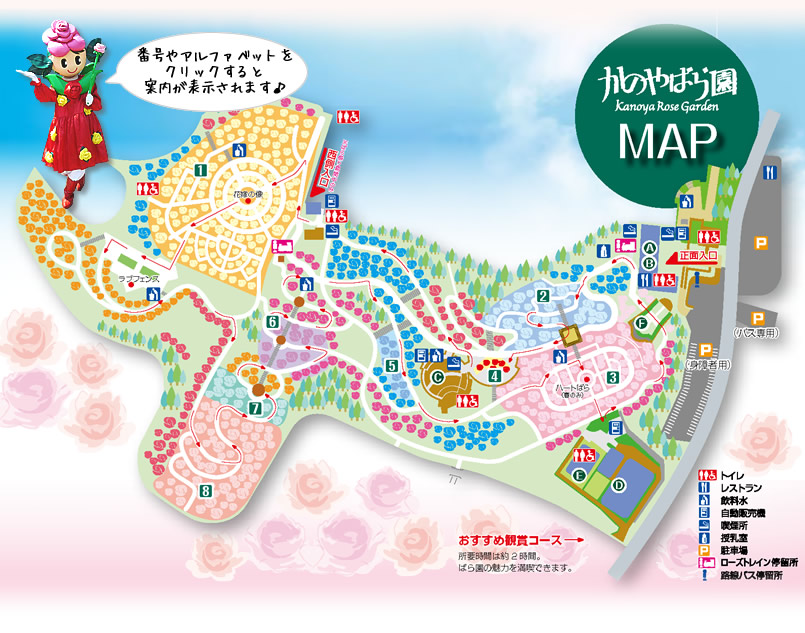 園内図左上にいる赤いドレスの女の子は、かのやばら園のシンボルキャラクター「ばらら」ちゃん。かのやばら園オリジナルのバラ「プリンセスかのや」から生まれた妖精で、かのやばら園のPRを担当しているそうです。