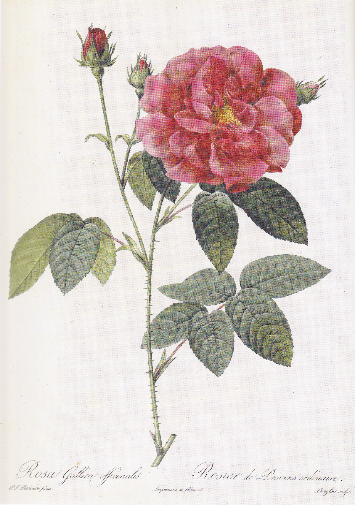 ▲ルドゥテが描いたロサ・ガリカ・オフィキナリス「Rosa gallica officinalis」