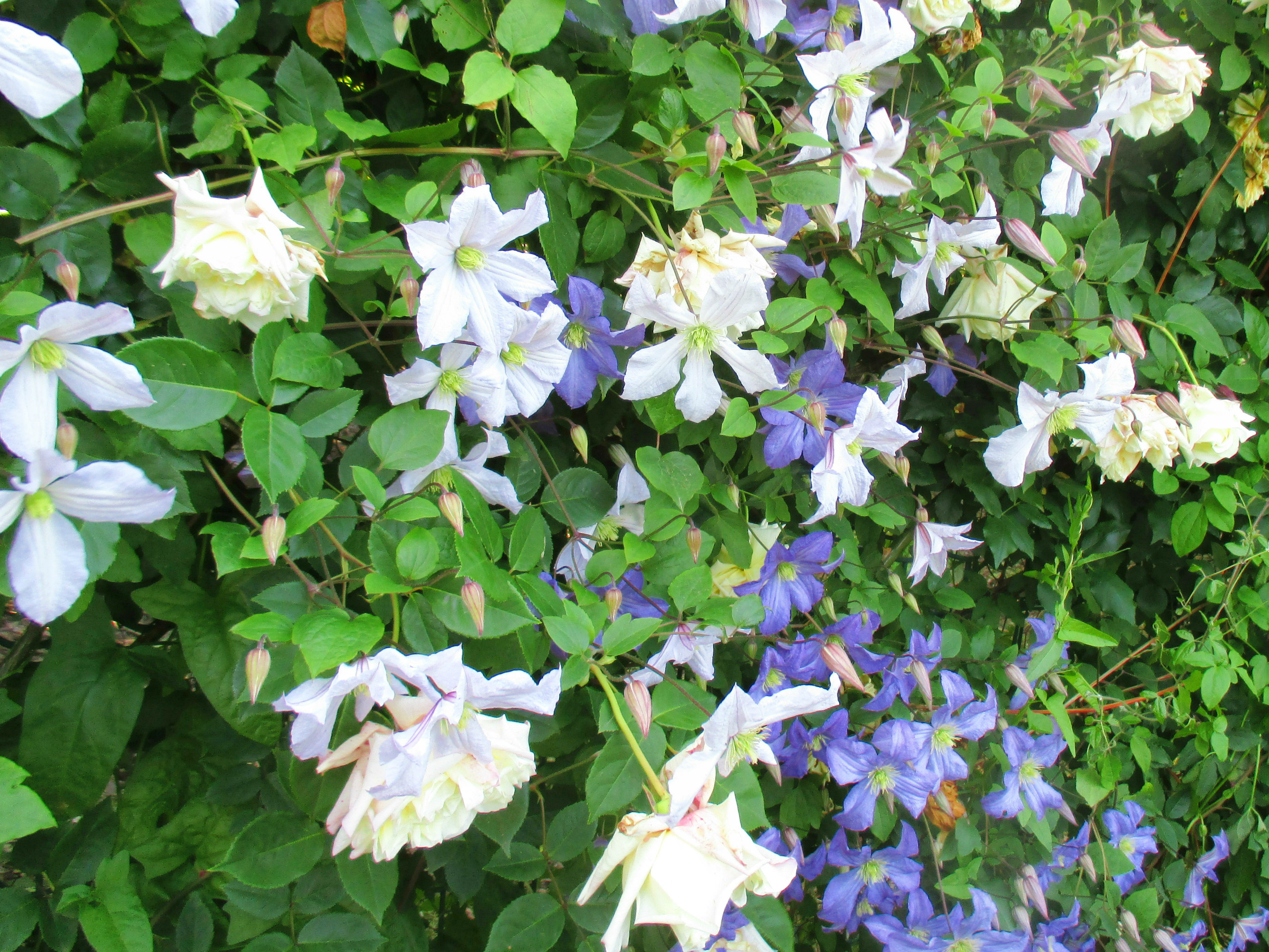 ▲クレマチスと一緒に壁に誘引したノワゼット系統の「アリスター・ステラグレイ」