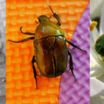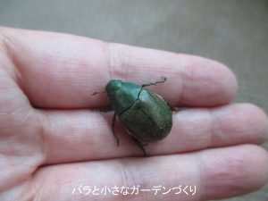になると現れる、ツヤツヤした緑色の甲虫。コガネムシです。じつはこのコガネムシ、バラの天敵と言ってもいいくらい怖い虫なのです。