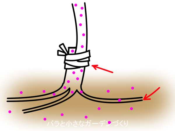上図のピンク色の●は、癌腫菌です。癌腫菌は土の中にいる細菌で、それがバラの根を切ったところや接ぎ木したときの傷口(どちらも赤矢印)から侵入して導管を伝い、バラ全体に広がります。