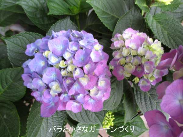 かなりピンク寄りの花もありますが、赤紫~青紫のグラデーションに咲きました。去年のピンク色から、かなり青寄りに改善されましたね^^ ピートモスと青アジサイの肥料が効いたようです。