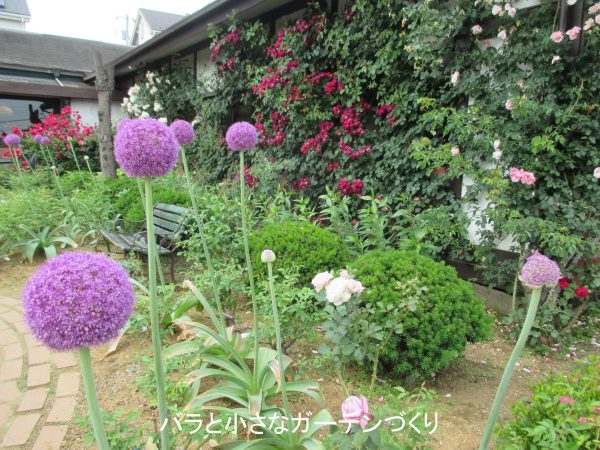 もちろん庭にはブッシュ樹形のバラも多く植えられています。春バラの季節なら、大きな紫色のねぎ坊主「アリウム・ギガンチウム」が庭に楽しいアクセントをつくってくれています。