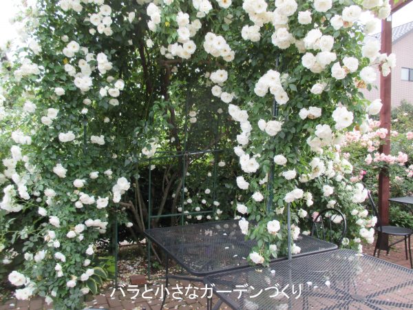 ▲ガーデンテーブルを囲むように咲きこぼれるつるバラ