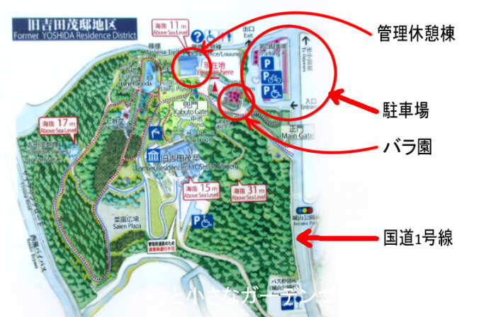 1号線を挟んだ反対側にある旧三井別邸地区にも立ち寄りましたが、こちらは急な坂道を登るのでちょっと大変でした。地元の方の犬の散歩にはぴったりですが、旧吉田茂邸のついでに寄るなら、展望台目当てに行くくらいでしょうか。こちらにバラはありません。(あいびー)