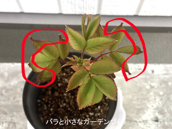 順調に若葉が広がってきているのですが、よく見ると葉の縁が巻いています! これは一大事! まだ日向では水揚げが間に合わず、チリチリになってしまったようです。