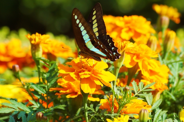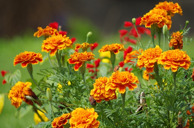 マリーゴールドは根にセンチュウ(とくにネグサレセンチュウ)の防除効果があり、さらに全草から異臭がするのでその香りでアブラムシやコナジラミを避けるとされています。畑では大根を腐らせてしまうネグサレセンチュウを減らすために大根を育てる前にマリーゴールドを植えたり、アブラムシやコナジラミ対策にトマトやナス、キュウリなどと一緒に植えられます。こういう、一緒に植えることで良い影響を与える植物をコンパニオンプランツといいますが、マリーゴールドはコンパニオンプランツに利用される代表的な植物です。